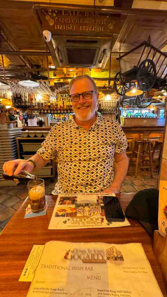 It had rained on and off throughout the tour but now it became torrential. Soaked, we went into the first pub (there are a lot of them) we came too which was called The Oliver St. John Gogertys. It was okay, I did like the live music, the food was edible, the drinks were horrendously expensive but the best thing it had going for it was that it was dry. It would have been nice if the food wasn’t also dry but you can’t have everything.