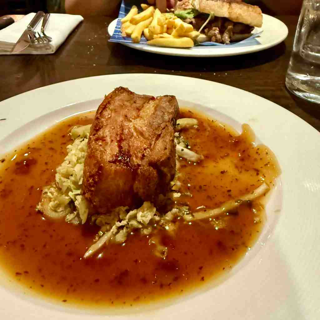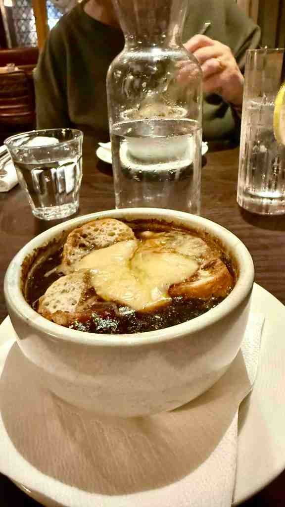 I didn’t realise when I booked that the hotel didn’t do food in the evening, instead providing a shuttle service to the centre of Salisbury. On reflection I like this idea but at the time I was a bit annoyed because I just wanted to eat and go to bed. It did give us a chance to have a look around Salisbury at night something we almost certainly wouldn’t have done. It also puts money into local restaurants and pubs which is a good thing. The hotel gave us a list of eateries and we decided on the Côte Salisbury. A French restaurant (chain) no less! Go Lyn trying new things. She had a Sirloin Steak Baguette with red onion jam, frites and homemade béarnaise to dip. Basically a beef sandwich with chips but it does sound better “Frenchified”.