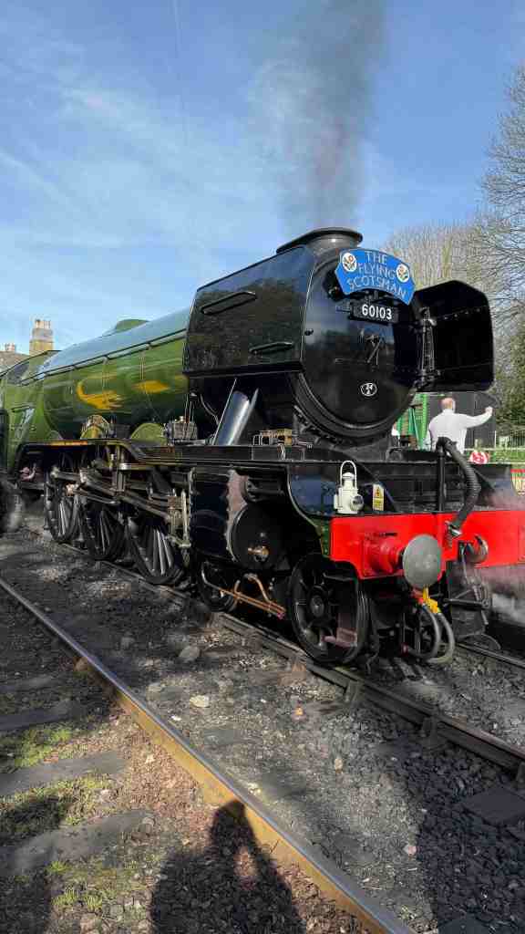 Our planned outing for March was a trip on the Flying Scotsman with my mother-in-law Mary. For this we had to travel back to Hampshire, our county of origin. It’s smaller than I remember and came across as very Middle England. There was definitely an over abundance of personalised number plates and while we were sat outside a coffee shop about half past 4 in Hartley Wintney a well-to-do middle aged woman in a business suite stomped past with a bottle of white wine in her hand. Which is a loverly clichéd image of Hampshire. I’d be surprised if the bottle made it home unopened.